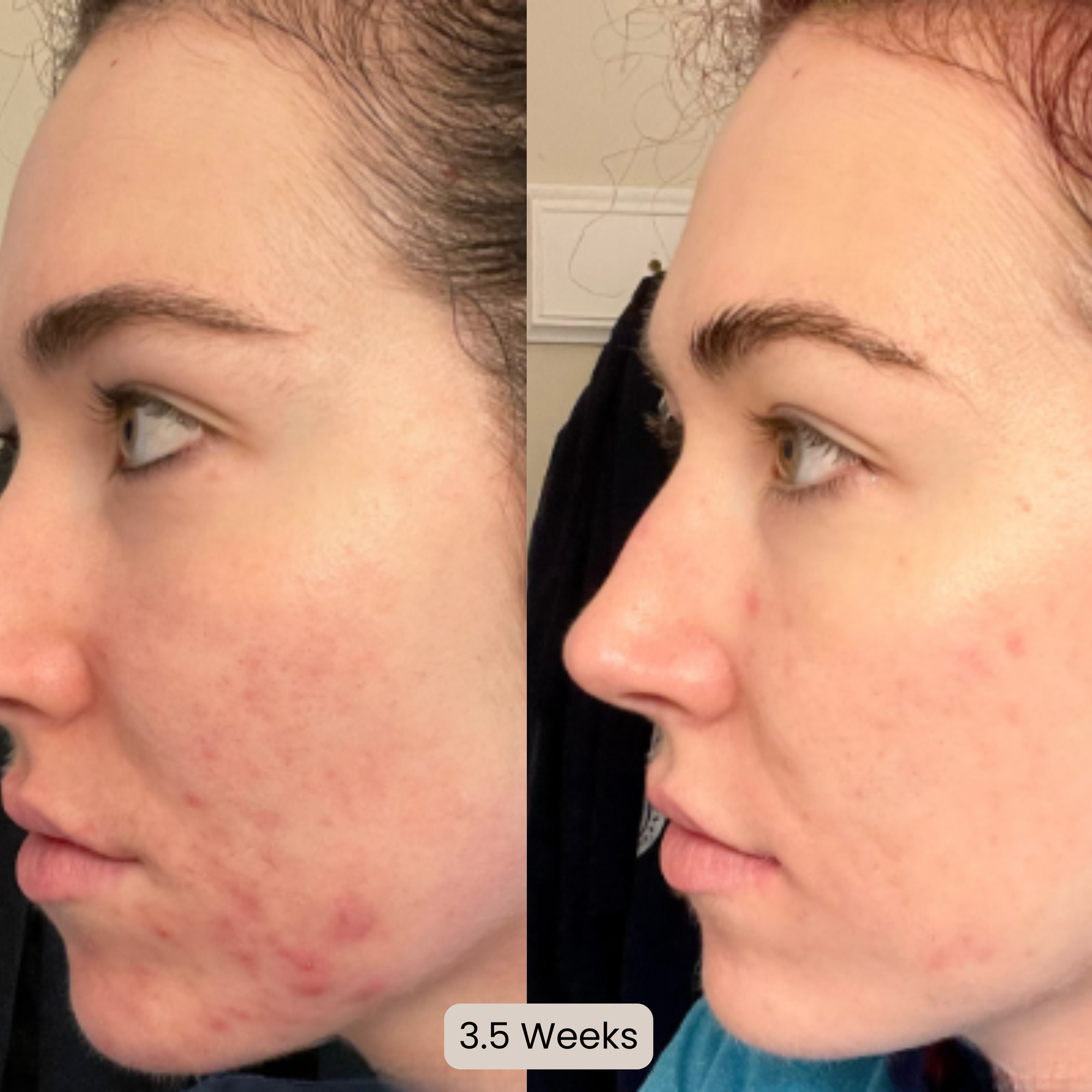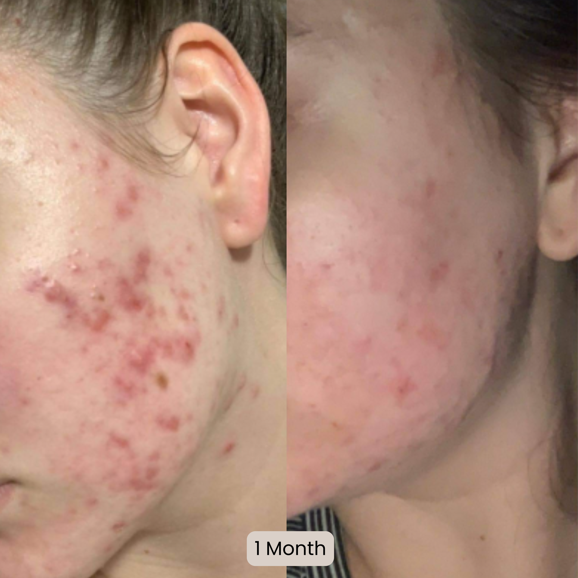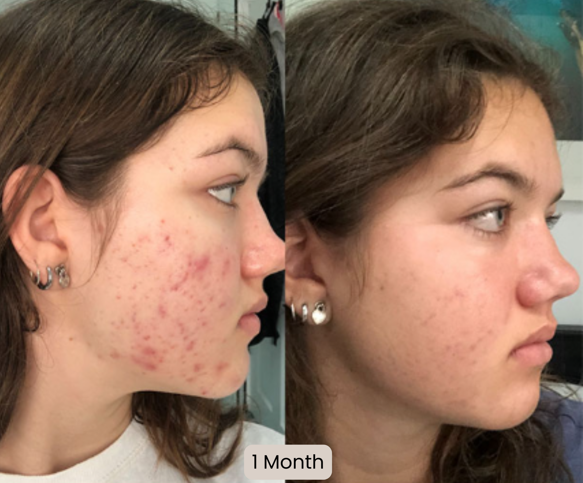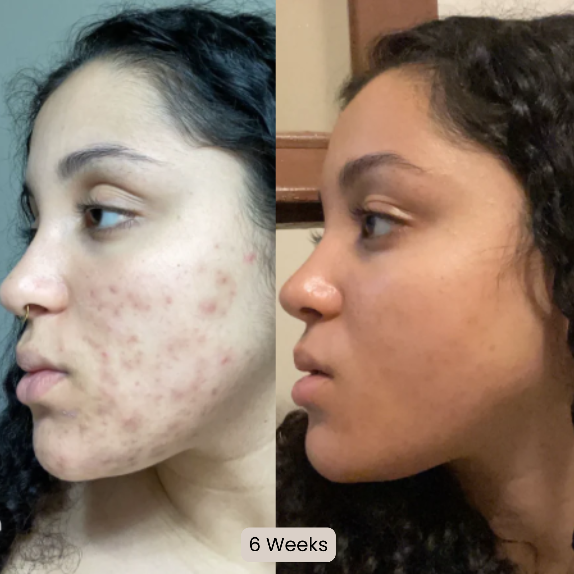 Skin improvements — like calmer, fewer breakouts — often appear around the next hormone cycle (2–4 weeks).
